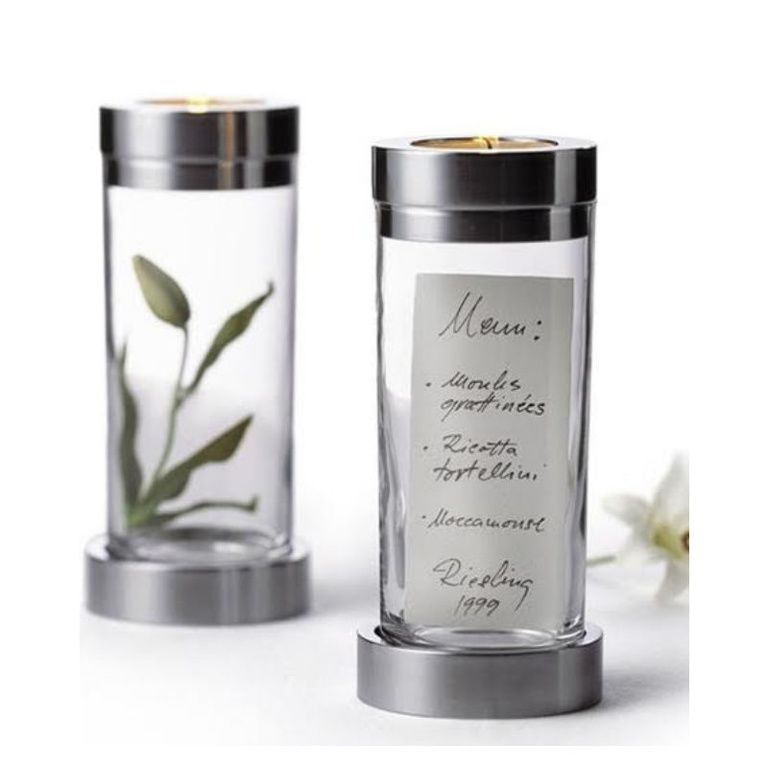 Käytä mielikuvitustasi tällä Galleria Kynttilänjalka Menu! Voit määrittää sisällöstä kynttilänjalka nimittäin itse, niin että se pysyy sopivaksi mielentilaan ja sisustus. Pari tuoreita kukkia vedessä, kuivatut nousi silmut, kivet, kuoret jne. Käytä mielikuvitustasi ja luoda henkilökohtaisia suunnittelu!