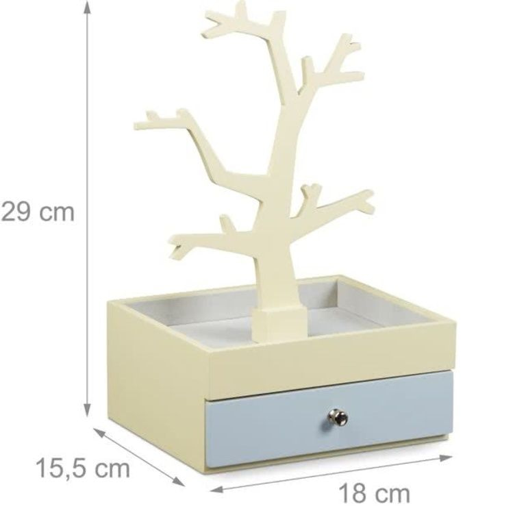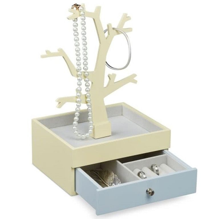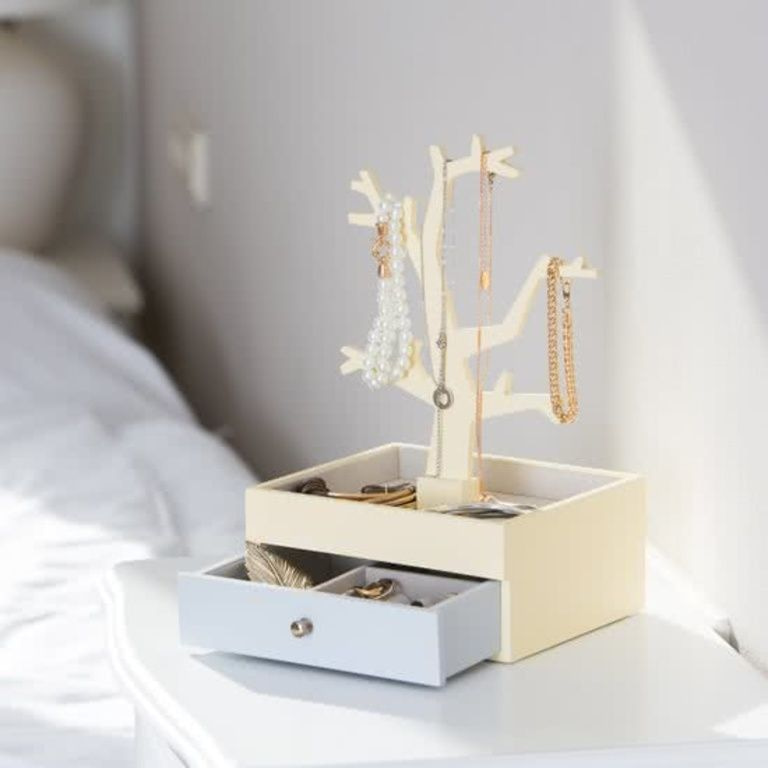 - beige-keltainen ja harmaa koruja laatikko laatikon ja koruja puu